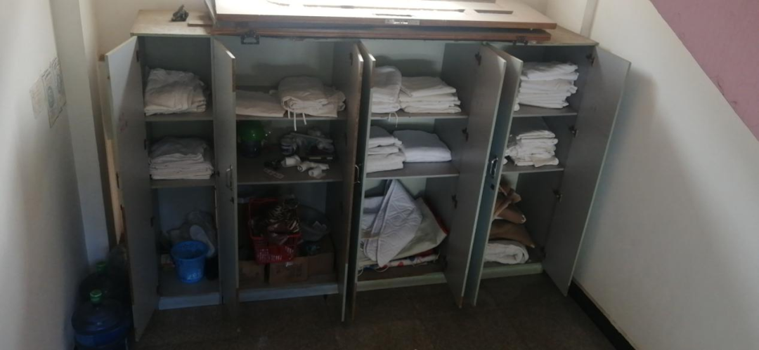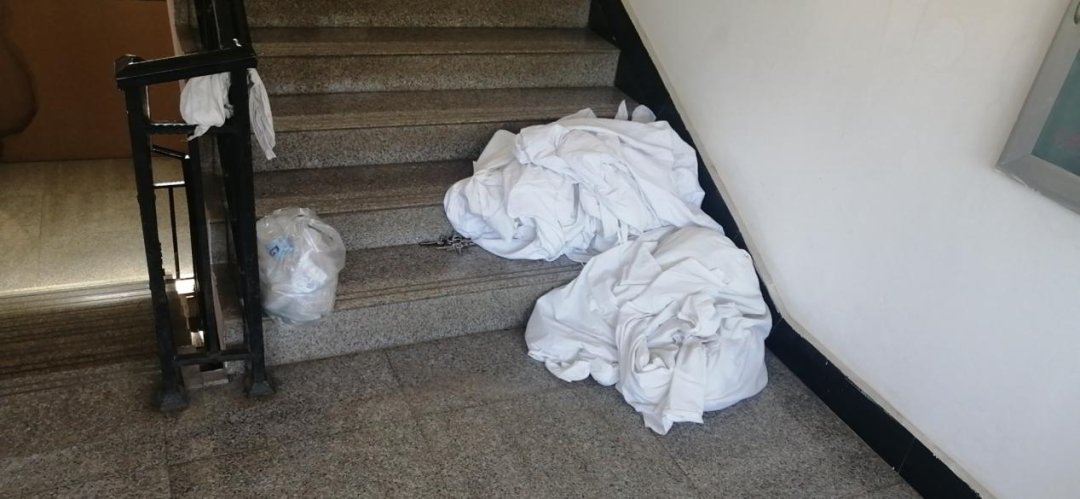 店内和前台环境卫生差,脏布草未放入回收筐直接堆放在地上,未放进布草柜;布草柜内堆放杂物、无标识。