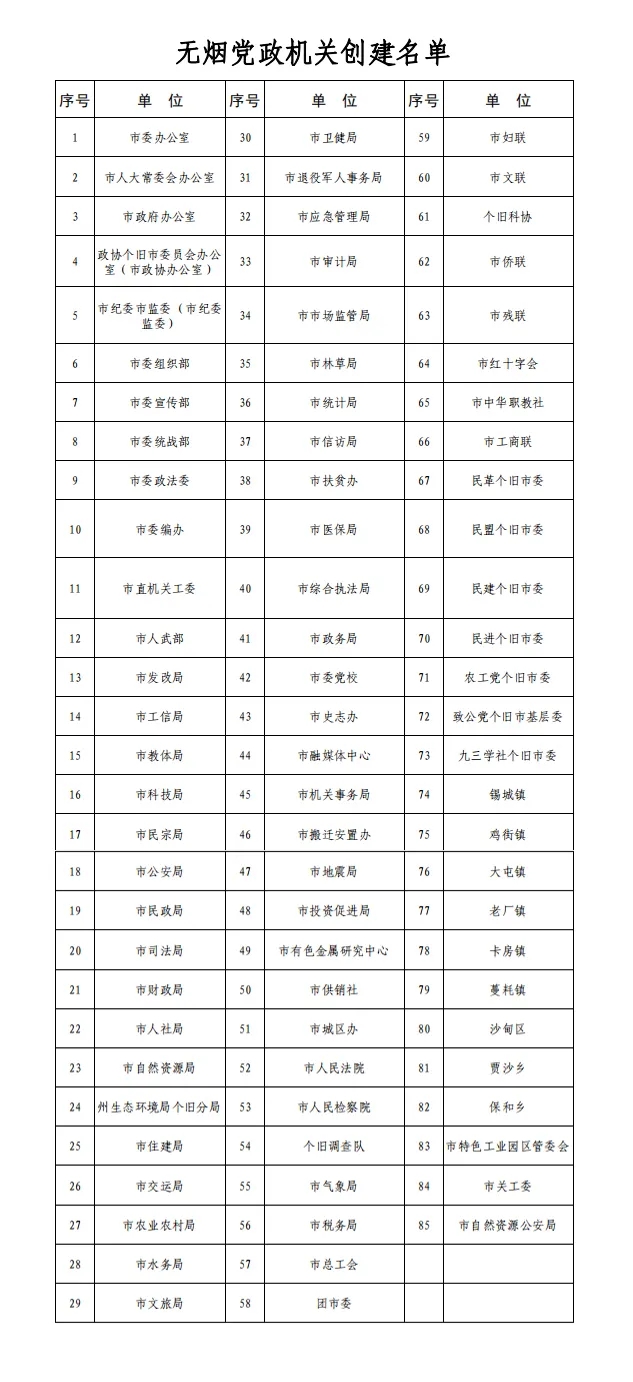 个旧市无烟党政机关公示名单公示为认真贯彻落实《云南省人民政府关于推进健康云南行动的实施意见》,个旧市卫生健康局、个旧市文明办、个旧市爱卫办《关于加强无烟党政机关建设的通知》等文件精神,推进爱国卫生“7个专项行动”,倡导践行健康文明“六条”新风尚,切实提高城市文明水平,推动全市无烟环境建设,充分发挥党政机关和领导干部在控烟工作中的示范引领作用,营造健康、文明、和谐的公共生活环境,个旧市卫生健康局、个旧市精神文明建设指导委员会办公室、个旧市爱国卫生运动委员会办公室于2020年联合制定了《关于印发个旧市2020年无烟党政机关、无烟医疗机构、无烟学校建设实施方案的通知》,在全市组织开展无烟党政机关建设活动,现将截至2021年4月建成的85家无烟党政机关名单进行公示,请广大市民对党政机关干部职工在公共场所吸烟、敬烟、劝烟的情况给予监督。