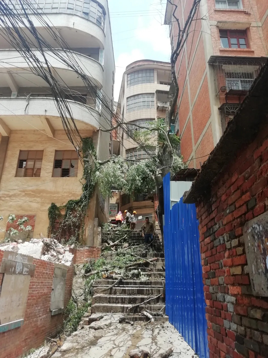 市交运局工程队将永胜街82号坡道上被枯树倒塌后造成的砸痕进行修缮,防止泥土松脱、滑落,并清理死角垃圾、杂物。