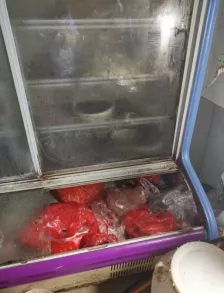 工作人员不穿戴工作衣帽,厨房三防设施有而不用,厨房卫生状况差,冰柜内存放有色塑料袋。