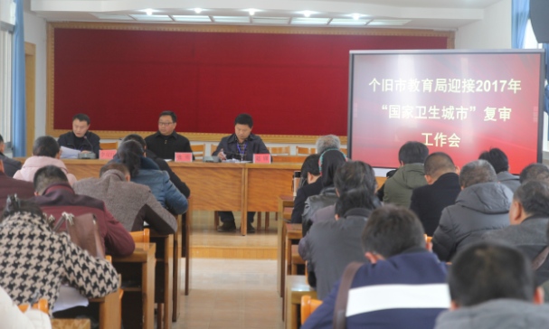 3月2日下午,个旧市教育局召开迎接2017年“国家卫生城市” 复审工作会。市教育局党委书记、局长张勇,市教育局副局长赵庸、李双红及全市公(民)办学校、幼儿园校(园)长等相关负责人参加了会议。