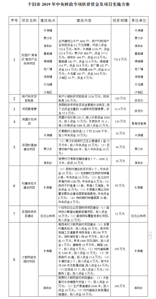项目建设计划及资金分配方案,结合个旧实际,紧紧围绕个旧市“十三五”脱贫攻坚规划工作思路和脱贫攻坚项目库建设,以贫困村、贫困户为重点,按照贫困村退出10项标准和贫困户退出6项标准要求,本着缺什么补什么的原则进行统筹安排,拟定项目资金计划方案。