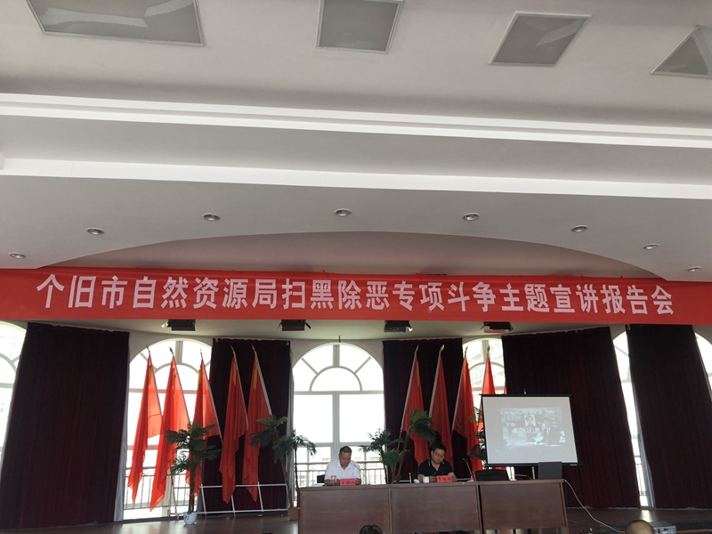 为进一步加大扫黑除恶专项斗争社会宣传力度,进一步畅通各类黑恶犯罪举报渠道,不断把扫黑除恶专项斗争引向深入,按照中央扫黑除恶专项斗争督导组“立查立改”的要求和省、州、市工作部署,2019年4月26日,个旧市自然资源局举办“开展扫黑除恶,建设善美云南”主题宣讲报告会,局机关干部职工共计24人参加了宣讲活动。个旧市委扫黑除恶专项斗争主题宣讲教育活动宣讲团成员、市扫黑办主任、市委政法委副书记李保福同志作宣讲报告,他围绕习近平总书记关于开展扫黑除恶专项斗争的重要指示精神,拟定了“政治站位需要提高”“安排部署要知道”“法规知识要了解”“宣传发动要加固”“法德并举知敬畏”五个方面的宣讲提纲,详细讲解了中央开展扫黑除恶专项斗争的背景、重大意义,中央、国务院和省、州、市党委政府开展扫黑除恶专项斗争的安排部署、工作要求、各阶段目标任务,扫黑除恶专项斗争有关的刑法、刑事诉讼法、治安处罚等法律法规,以及人民群众在扫黑除恶专项斗争中的主体地位等内容。同时,结合扫黑除恶专项斗争中出现的重点典型案例,通过剖析金平县原国土资源局局长充当“保护伞”案件,针对自然资源管理行业领域存在的乱点问题,对认真开展重点领域专项整治,深入开展扫黑除恶专项斗争提出了指导意见。