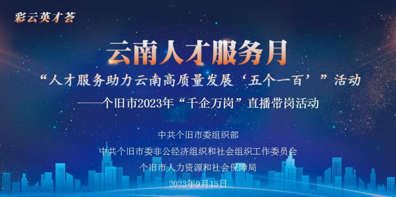 9月15日,中共个旧市委组织部、中共个旧市委非公经济组织和社会组织工作委员会、个旧市人力资源和社会保障局联合举办了个旧市2023年“彩云英才荟”之“云南人才服务月”暨“千企万岗”直播带岗活动,以优质温暖的服务助企纾困、促民就业,让就业岗位触“屏”可及。