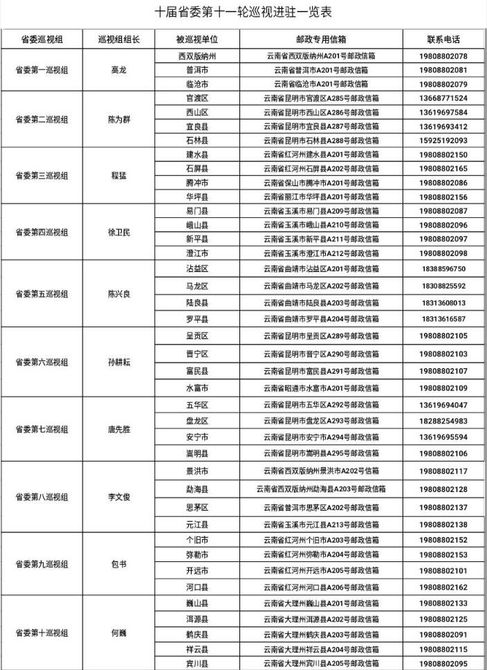 根据省委统一部署,十届省委第十一轮巡视安排1个巡视组对西双版纳州、普洱市、临沧市开展生态环境保护专项巡视,安排9个巡视组分别对官渡区、西山区、宜良县、石林县、建水县、石屏县、腾冲市、华坪县、易门县、峨山县、新平县、澄江市、沾益区、马龙区、陆良县、罗平县、呈贡区、晋宁区、富民县、水富市、五华区、盘龙区、安宁市、嵩明县、景洪市、勐海县、思茅区、元江县、个旧市、弥勒市、开远市、河口县、巍山县、洱源县、鹤庆县、祥云县、宾川县开展常规巡视。