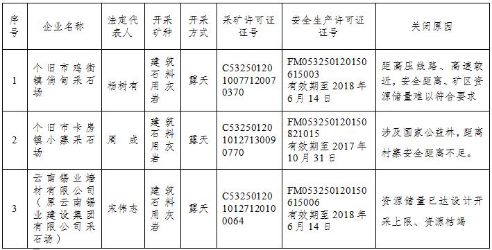 为切实调整我市非煤矿山产业结构,彻底改变我市矿山“小、散、乱、差”现状,实现非煤矿山科学发展、安全发展。按照《云南省人民政府关于促进非煤矿山转型升级的实施意见》(云政发〔2015〕38号)《红河州人民政府关于印发红河州非煤矿山转型升级实施细则的通知》(红政办发〔2015〕60号)《个旧市人民政府关于印发个旧市非煤矿山转型升级实施细则的通知》(个政办发〔2015〕95号)《个旧市人民政府关于予以审定个旧市非煤矿山转型升级工作方案的请示》(个政办发〔2015〕146号)的要求,根据2018年3月2日个旧市非煤矿山转型升级工作联席会议纪要决定,个旧市鸡街镇倘甸采石场、个旧市卡房镇小寨采石场、云南锡业墙材有限公司(原云南锡业建设集团有限公司采石场)3座矿山被列为淘汰关闭,现将名单公告如下: