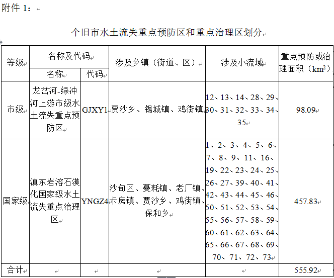 附件:1、个旧市水土流失重点预防区和重点治理区划分