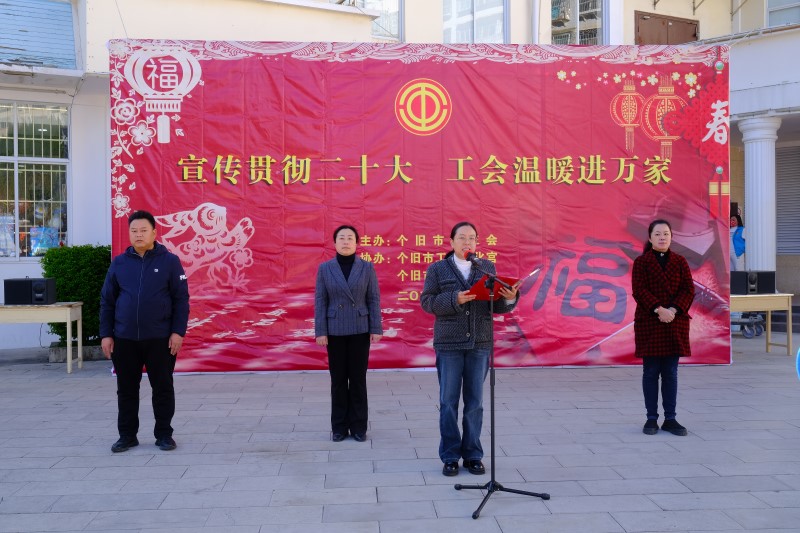 为深入学习贯彻党的二十大精神,进一步推进“三话六学”实践活动,喜迎即将到来的新春佳节,1月15日上午,个旧市总工会在市工人文化宫开展“送万福、进万家”书法公益活动及“宣传贯彻二十大 工会温暖进万家”活动。此次活动由市总工会党组书记、常务副主席杨钧致辞,市人大常委会副主任、市总工会主席许雪梅宣布活动开始。