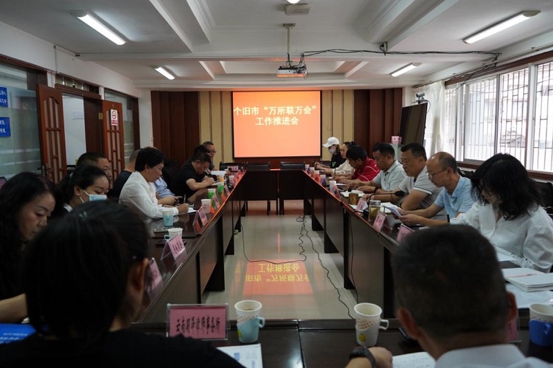 2022年8月25日下午,个旧市召开“万所联万会”工作推进会,市政协副主席、市工商联主席叶华,市政协教科卫体和社会法制委主任周建龙,市司法局党组书记、局长张松,9家商协会代表,市属3家律师事务所代表等共计20余人参加了会议。