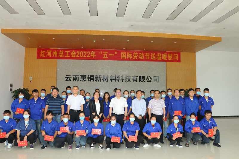 此次活动由州总工会党组书记、常务副主席姜云带队,州总工会劳动和经济工作部部长许颖,州职工服务中心副主任李雷组成的州总工会慰问组,在市委常委、市委宣传部部长李嘉龙,市人大常委会副主任、市总工会主席许雪梅,以及市总工会相关领导的陪同下,走访慰问了个旧市云南惠铜新材料科技有限公司的一线职工,慰问组为节日期间奋战在重点工程项目及疫情防控的一线职工送上慰问金及慰问信,并详细了解项目情况、工程进度、职工工作及生活情况,祝他们“五一”节快乐,度过一个祥和、温馨的节日,叮嘱他们做好安全生产防护工作,让他们充分感受党和政府的关怀和工会组织的温暖。