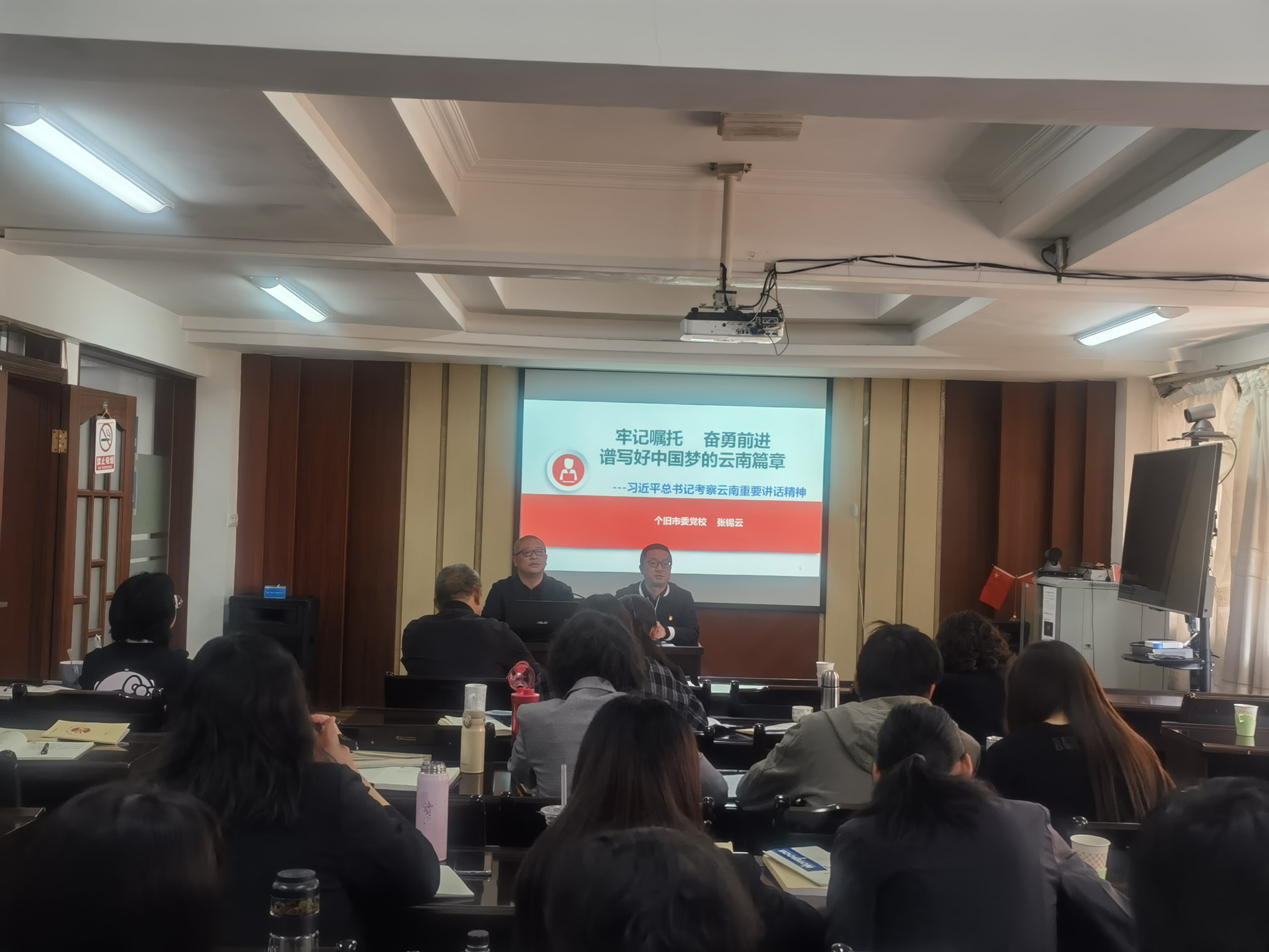 ●3月26日,市委党校张锡云老师以《牢记嘱托 奋勇前进 谱写好中国梦的云南篇章》为题,从“正确认识和把握云南在全国发展大局中的地位和作用,坚持新发展理念、推动经济高质量发展,认真贯彻落实党的十九届四中全会精神、不断增强边疆民族地区治理能力,保障和改善民生、决战脱贫攻坚,践行初心使命、激发奋进新时代的力量”五个方面讲解了习近平总书记考察云南重要讲话精神,张老师的讲课结合实际,通俗易懂,使大家进一步学深悟透。
