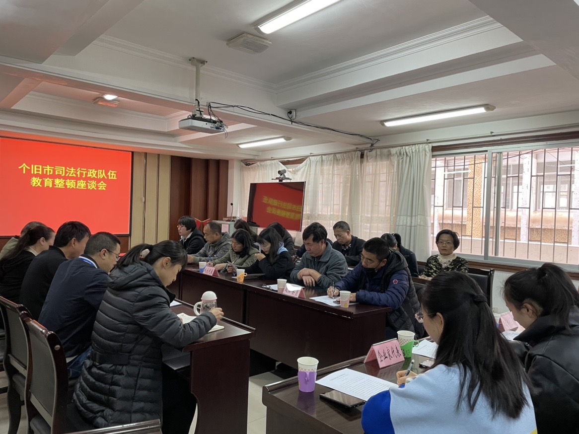 为凝聚社会共识,了解群众所思所想所盼,广泛听取社会各界的意见和建议,提高司法行政队伍教育整顿实效,3月22日下午,个旧市司法局召开队伍教育整顿座谈会,邀请部分人大代表、政协委员、企业家代表、律师代表、基层法律服务工作者代表、人民陪审员代表及乡镇政法委员广泛征求意见,全面收集存在问题和意见建议,市司法局领导班子成员、各相关科室同志参加了会议。