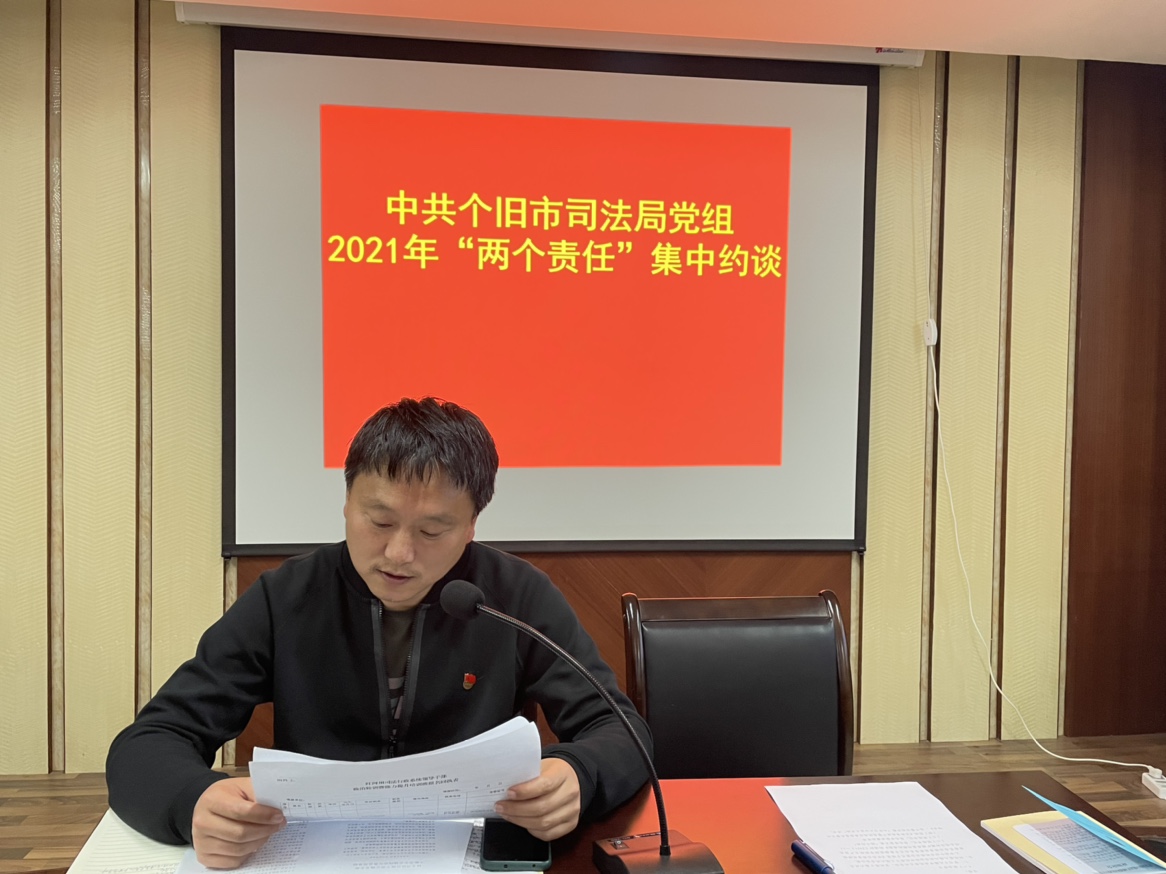 为推动政法队伍教育整顿取得实效,锻造绝对忠诚、绝对纯洁、绝对可靠的司法行政队伍,3月18日,个旧市司法局召开司法行政队伍教育整顿“大学习大讨论大交流”活动暨党风廉政建设“两个责任”集中约谈,以“四个开展”组织全体干部职工共54人深入讲学、深刻讨论、深入交流了教育整顿内容。