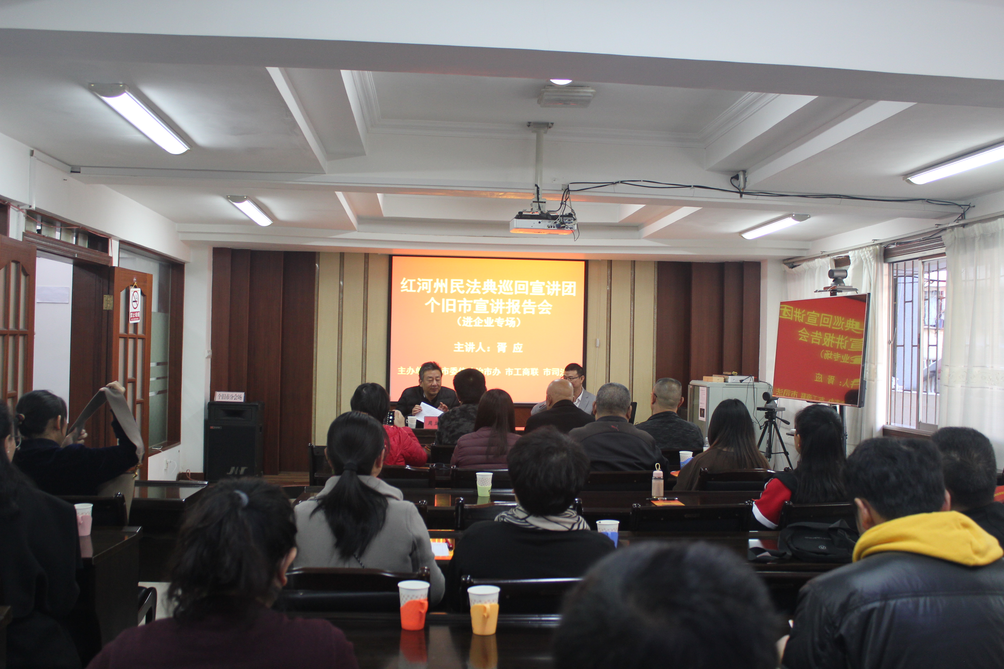 《中华人民共和国民法典》(以下简称民法典)同人民群众生产生活紧密相关,影响着社会生活的方方面面,是社会生活的百科全书。为切实让民法典走到机关干部、社会群众、老师学生身边,红河州民法典巡回宣讲团第一宣讲组组长、州委讲师团副团长蔡大坤,宣讲团成员、州律师协会副会长、云南众序律师事务所主任胥应,宣讲团成员、州委讲师团讲师李志兴,深入机关单位、民营企业、学校开展民法典宣讲活动,推动社会大众进一步了解民法典、尊崇民法典、遵守民法典。
