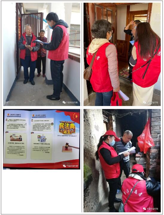 普法志愿“红”送“典”入户,推动线下宣传落地落实。1月4日至7日,结合疫情防控要求,个旧市组建普法志愿者服务队,对社区居民进行疫情防控排查,为社区居民解答疫情相关法律法规,同时将民法典送进社区、送进居民家中。一是告知群众民法典于2021年1月1日起正式施行,原有的婚姻法、继承法、民法通则、民法总则等9部法律同时废止,民法典实施以后,是一切民事活动的总章程和依据。二是向社区住户发放民法典宣传册子,结合册子的宣传图片给群众简要地从新增法律、亮点条款等介绍民法典相关知识。普法志愿者身着鲜红的志愿服装,穿梭于大街小巷,构成锡都一道亮丽的风景线,将民法典送进社区,社区居民对志愿者表示感谢,同时也表示将努力学习了解民法典,依法进行民事活动、依法维护自身合法权益。截至目前,送“典”入户120户400余人。