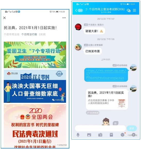 宣传载体齐上阵,开展线上宣传营造普法氛围。一是通过微信、微博等线上载体开展宣传。利用“锡都个旧”、“个旧司法行政”等普法微矩阵转载宣传民法典、首批民法典司法解释等内容;二是通过工作群转发宣传,以点带面、从线到片,逐步形成普法宣传联动区域;三是利用出租车、公交车等交通工具语音播放民法典,利用银行、超市、药店等公共场所电子屏滚动播放民法典宣传标语,通过反复播放,真正做到民法典宣传全覆盖;四是通过开展答题活动充分调动干部职工学习民法典的积极性和主动性,促进答于“指尖”、记于心里,确保答有所获、答有所悟,推动以答促学、以学促用。截至目前,共参与答题3800余次。