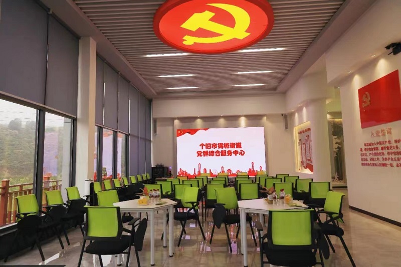 锡城街道党群综合服务中心位于个旧市锡城街道阳山社区老冠居民小组,坐落于环境优美的阳山生态公园内,服务大厅面积290平方米,设置有便民服务平台、锡城历史及发展成果展示间、生态文明建设展览馆、图书阅览室、党员活动室、儿童活动空间等功能分区,可开展教育培训、成果展示、综合服务、参观交流等多种活动,面向区域内各级党组织及其党员、各群团组织及群众免费开放,最多可同时容纳100余人开展活动。