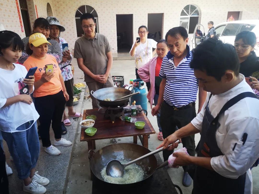 杨明厨师详细向村民展示了凉米线、鲍汁红烧肉、黄焖鸡、爆炒猪肚、炸酥肉、胡辣鱼的做法。