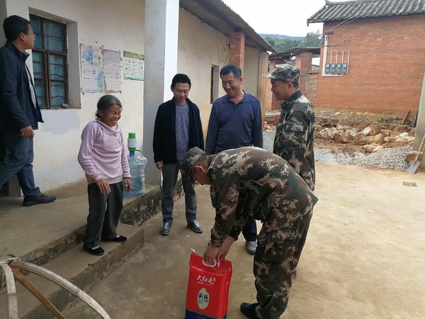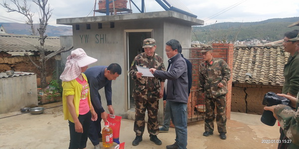 树高千丈不忘根,鱼水情深暖民心。2020年1月3日,武警某部机动支队冬季野营拉练途中,为弘扬长征精神,发扬部队优良传统,支队副政委带领部队官兵在市退役军人事务局、鸡街镇党委一行人带领下来到石榴坝村委会,对当地的贫困户进行慰问,并为他们送去米、油等生活用品,缓解了他们的生活压力。