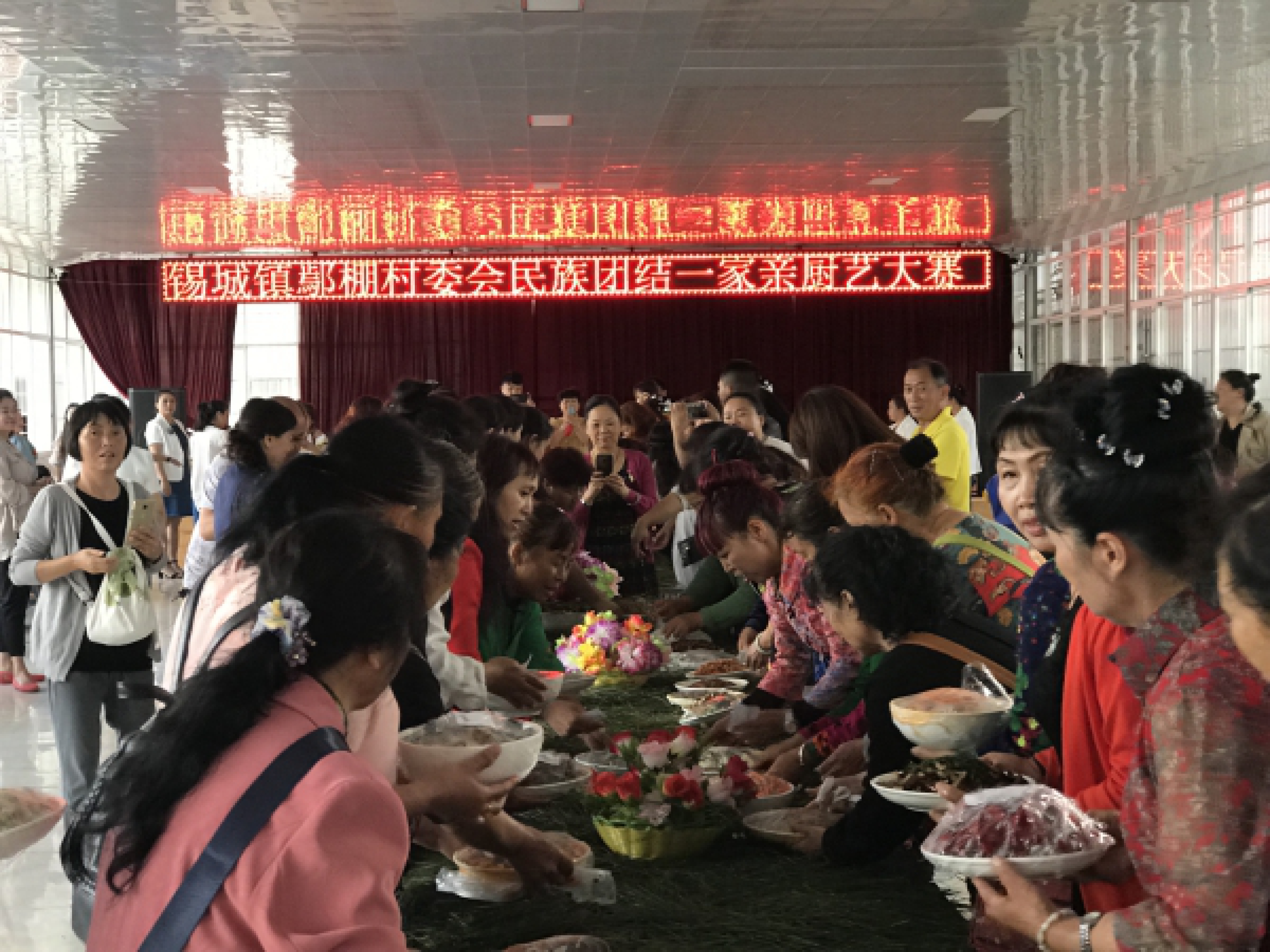 为弘扬民族传统饮食文化,营造民族团结和谐氛围,锡城镇鄢棚村委会举行“民族团结一家亲”厨艺大赛,主题为各民族特色菜,以促进各民族间相互学习,相互交流,增进了解,培养感情。来自鄢棚村委会8个小组109户居民携带109道拿手特色菜参加了比赛。