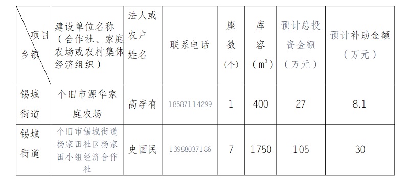 个旧市锡城街道2022年农产品产地冷藏保鲜设施建设公示表