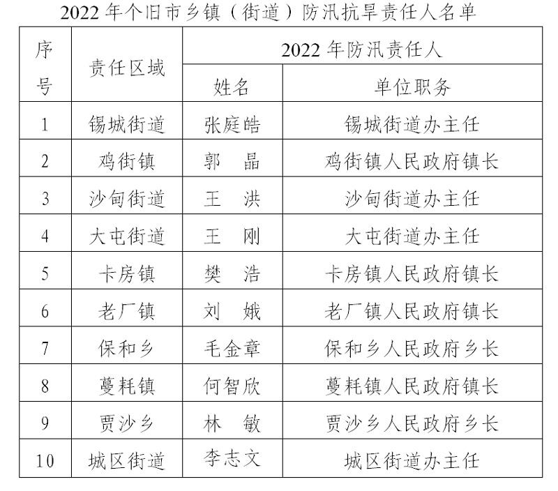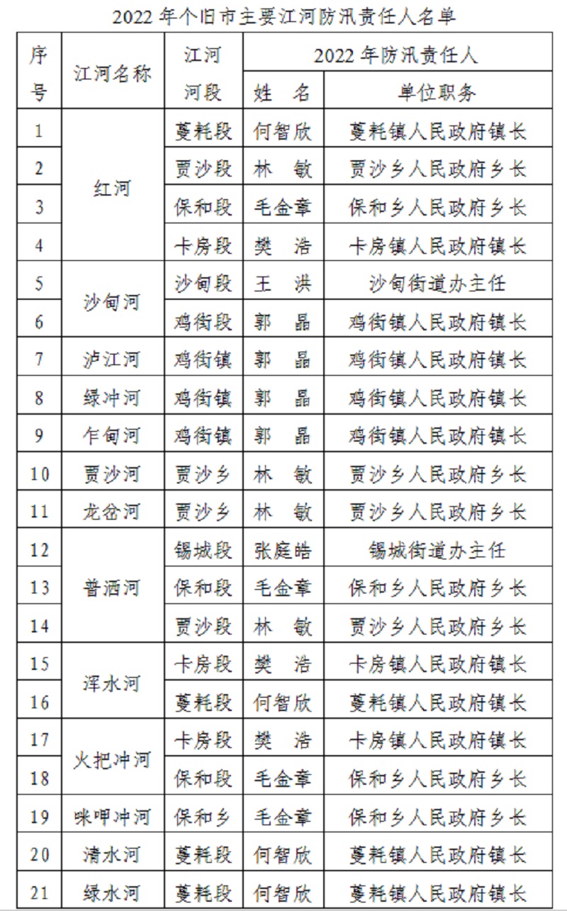 根据《中华人民共和国防洪法》、《中华人民共和国抗旱条例》和《云南省防洪条例》、《云南省抗旱条例》等法律法规相关规定,为贯彻落实防汛抗洪、抗旱减灾工作责任制度,切实做好我市2022年防汛抗旱工作,保障防洪和饮水安全,现将全市各乡镇(街道)防汛抗旱、主要江河防汛责任人名单向社会进行公告,并接受社会各界的监督。