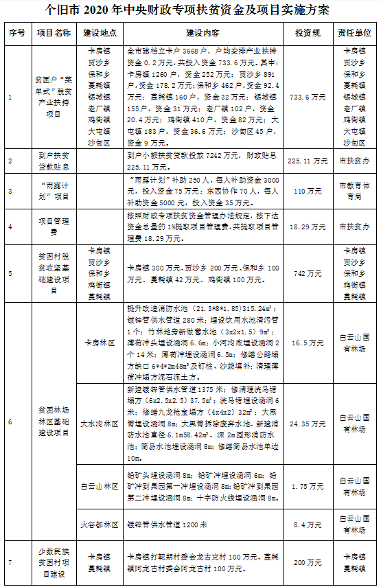 根据《红河州财政局关于提前下达非贫困县2020年第一批中央财政专项扶贫资金的通知》(红财农发〔2019〕106号)、《红河州财政局关于提前下达非贫困县2020年第二批中央财政专项扶贫资金的通知》(红财农发〔2019〕103号)文件精神,下达个旧市中央财政专项扶贫资金2080万元,按照项目申报审批程序,资金分配及项目实施方案已拟定,现将个旧市中央财政专项扶贫资金及项目安排情况公示如下: