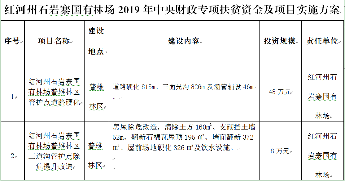 根据《红河州财政局关于提前下达非贫困县2019年第一批中央财政专项扶贫资金的通知》(红财农发〔2018〕104号)文件精神,下达红河州石岩寨国有林场中央财政专项扶贫资金56万元,按照项目申报审批程序,资金分配及项目实施方案已拟定,现将红河州石岩寨国有林场中央财政专项扶贫资金及项目安排情况公告公示如下: