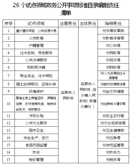 三、请涉及26个试点领域的州直部门认真对照国务院有关部门制定的标准指引,结合本部门权责清单和公共服务事项清单,按照“应公开、尽公开”原则,梳理细化权力运行和政务服务各个环节产生的政府信息,逐项认定公开属性,明确公开事项的名称、内容、依据、时限、主体、方式、渠道、公开对象等要素,于2020年7月30日前编制完成相关领域政务公开标准目录,同时在州人民政府门户网站进行公开。州直有关部门要主动对接省级主管部门,指导基层政府完成本领域的政务公开事项标准目录编制工作。