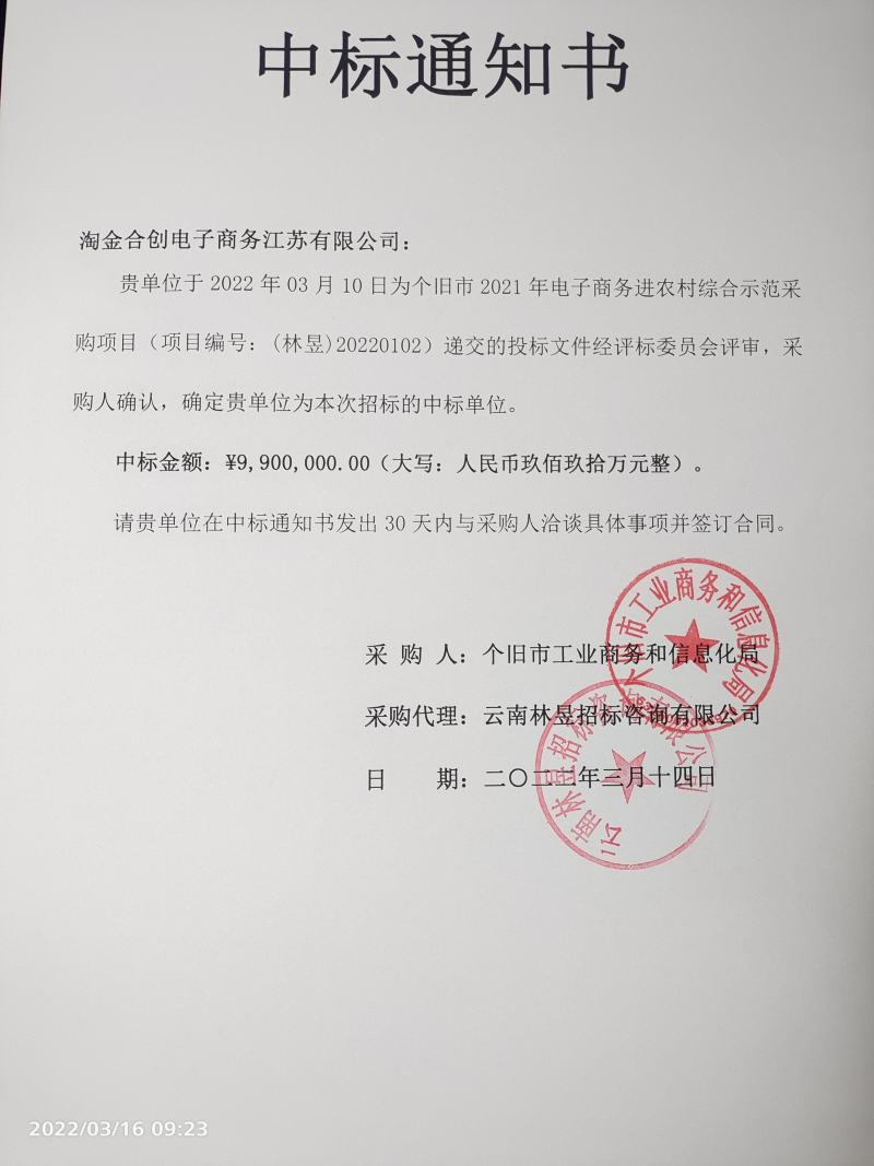 个旧市2021年电子商务进农村综合示范采购项目中标公告