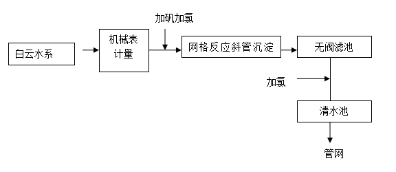 作为普洒河城市供水工程的附属工程老冠水厂,于2000年建成投入使用,老冠水厂占地3000多平方米,进水高程1891.60米,出水高程1887.05米,日处理能力6000立方米。建清水池3个,容量1000立方米,工艺流程为: