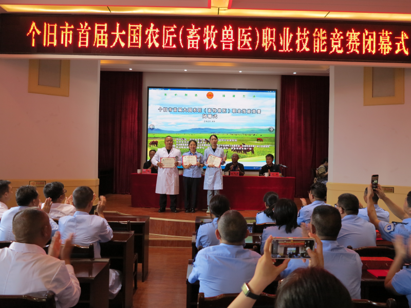 9月22日,由个旧市总工会、个旧市农业农村局、个旧市人力资源和社会保障局联合主办的个旧市首届大国农匠(畜牧兽医)职业技能竞赛在红河州农业科技培训服务中心圆满闭幕,红河州畜牧技术推广站农业推广研究员孔凡勇,个旧市农业农村局副局长、畜牧兽医局局长龙泽,个旧市总工会组织民管和劳动经济部副部长张玉军,个旧市农业农村局工会主席邹旭参加闭幕式并为获奖选手颁奖。