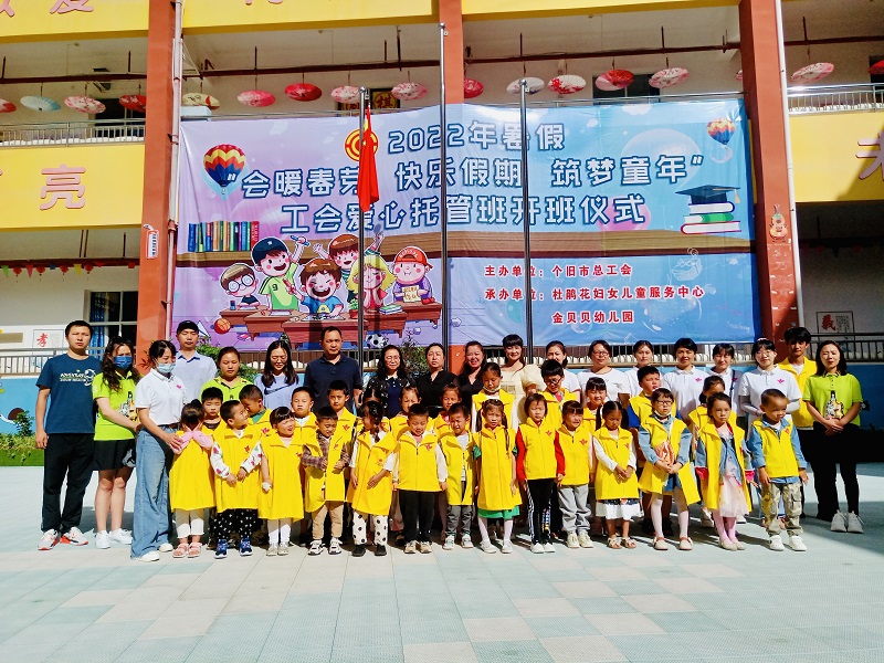 暑期来了,学校放假,孩子该去哪儿?这成了不少家长的烦恼。为进一步深入推动工会组织做实做细三孩生育政策下职工关爱服务工作,满足职工需求、解决职工子女“看护难”问题。7月25日,市总工会在省总工会第五蹲点调研组的指导和帮助下,围绕党政所需、职工所盼、工会所能,以“丰富职工家庭业余文娱生活,促进职工家庭健康和谐”为主题,联合个旧市杜鹃花妇女儿童服务中心、金贝贝幼儿园共同开启了 “会暖春芽 快乐假期 筑梦童年”爱心托管班。市人大常委会副主任、市总工会主席许雪梅出席开班仪式并作致辞,22名小朋友及家长参与了此次开班仪式。