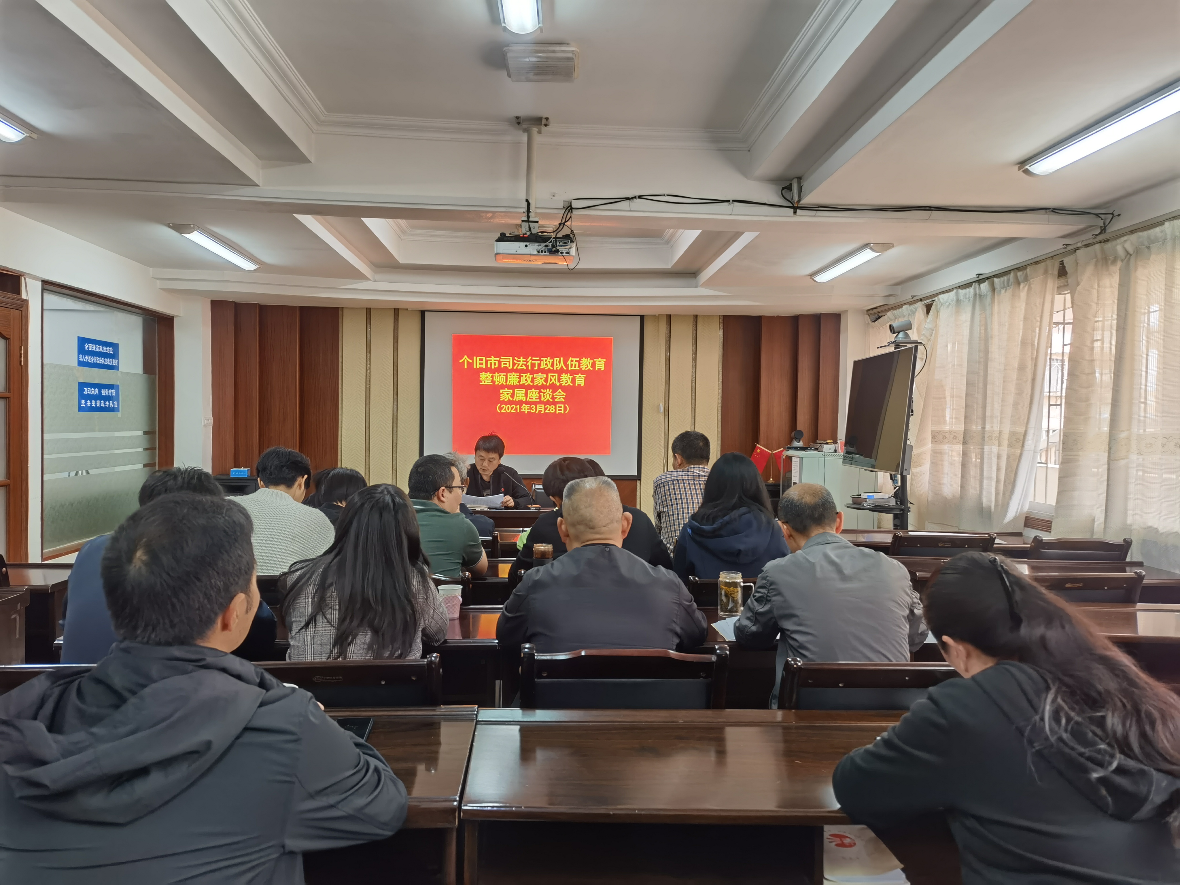 3月28日上午,个旧市司法局召开队伍教育整顿廉政家风教育家属座谈会,进一步发挥家属在廉政家风建设中的特殊作用,积极配合我局加强对干警的教育、预防和监督,构筑起家庭反腐败的牢固防线。局领导班子、部分干警及家属参加了会议。