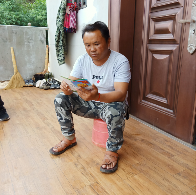 (图为:贫困户在仔细阅读民法典宣传资料)