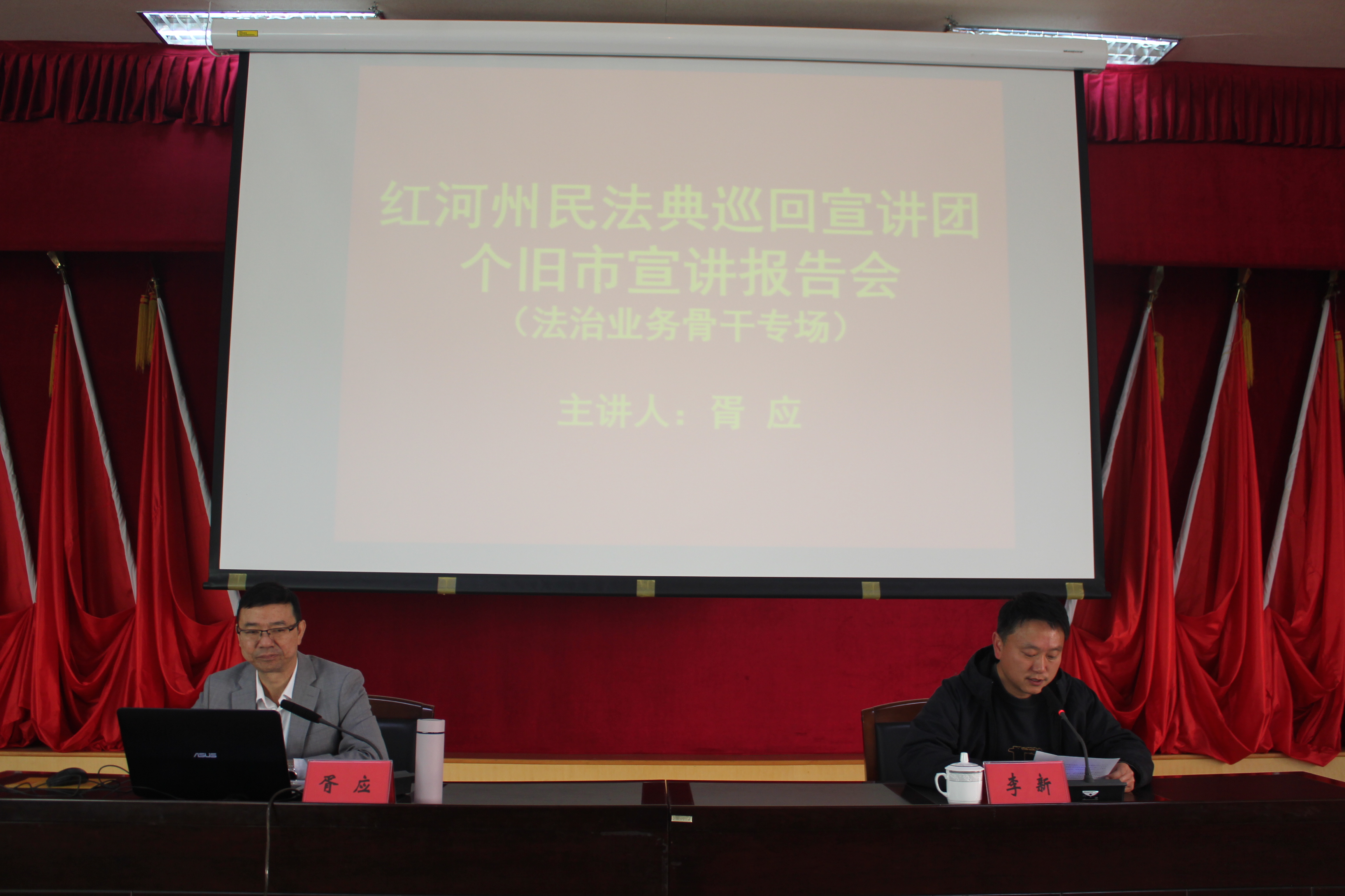 《中华人民共和国民法典》(以下简称民法典)同人民群众生产生活紧密相关,影响着社会生活的方方面面,是社会生活的百科全书。为切实让民法典走到机关干部、社会群众、老师学生身边,红河州民法典巡回宣讲团第一宣讲组组长、州委讲师团副团长蔡大坤,宣讲团成员、州律师协会副会长、云南众序律师事务所主任胥应,宣讲团成员、州委讲师团讲师李志兴,深入机关单位、民营企业、学校开展民法典宣讲活动,推动社会大众进一步了解民法典、尊崇民法典、遵守民法典。