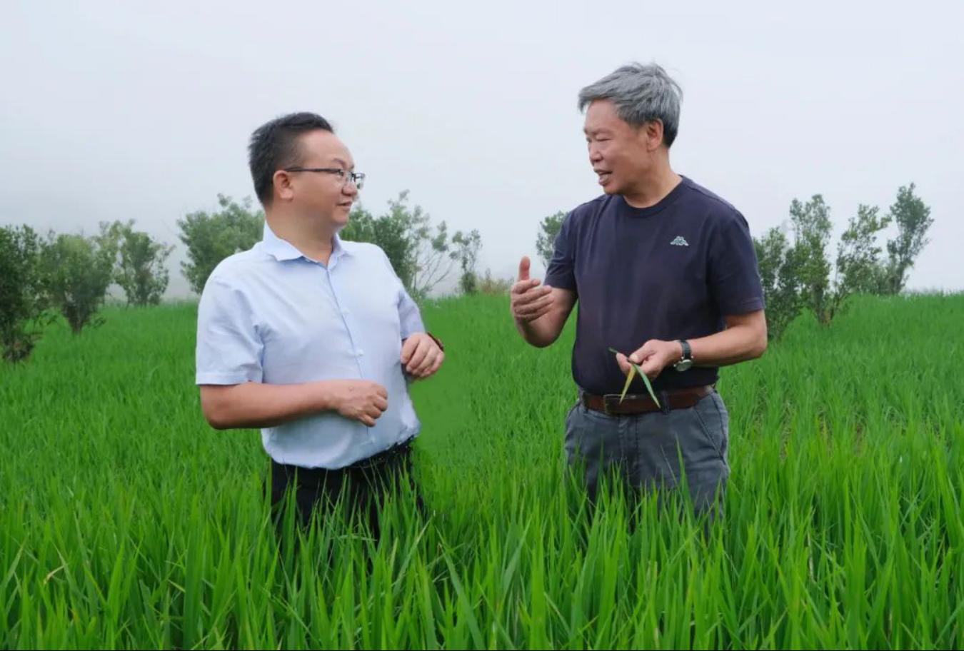 ▲朱有勇(右)、陆永开(左)查看旱地优质稻生长情况